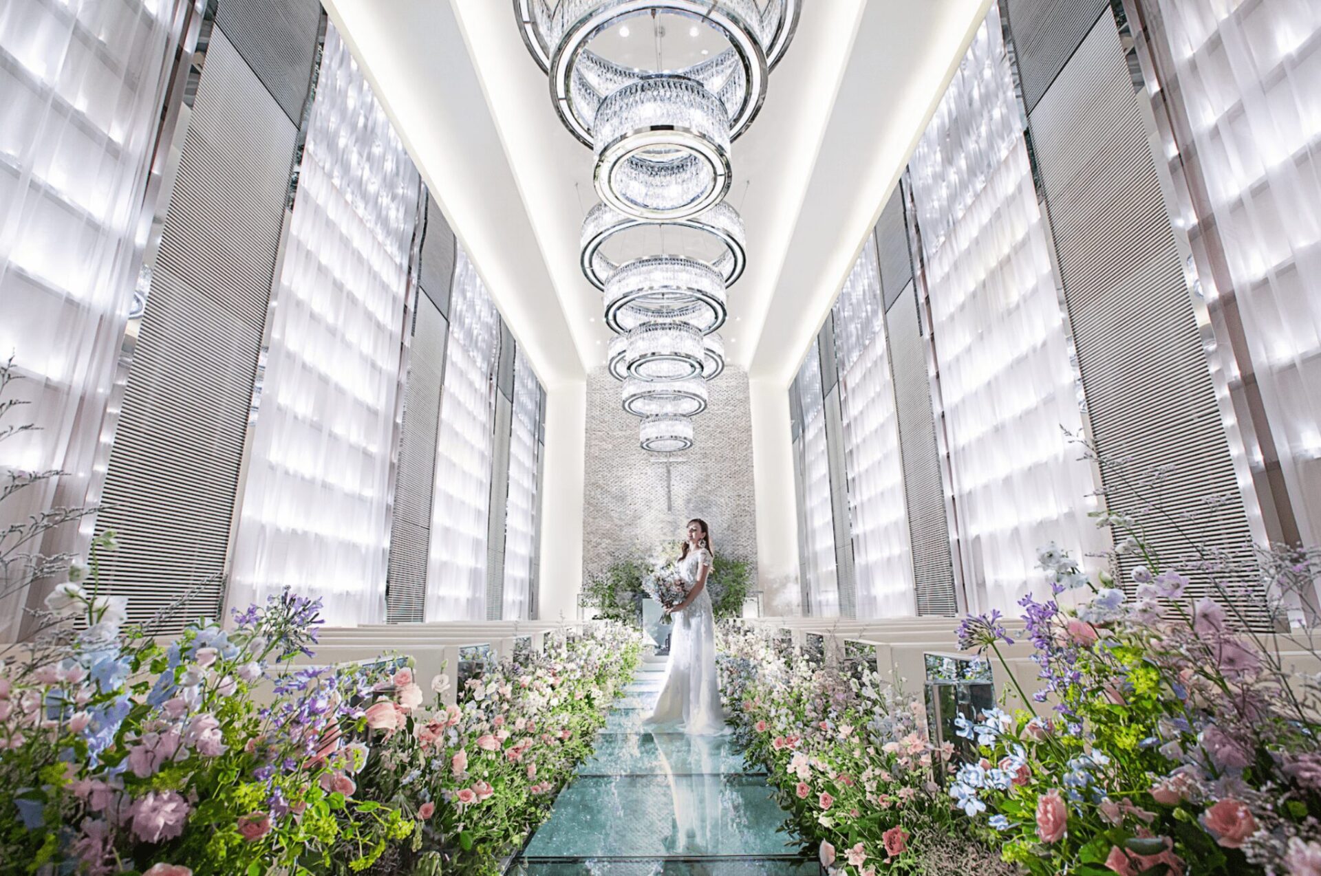 ガラスのバージンロードと700個のキャンドルが幻想的な空間を創出する結婚式場